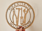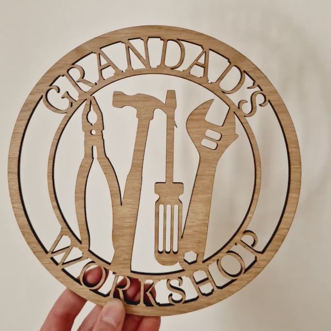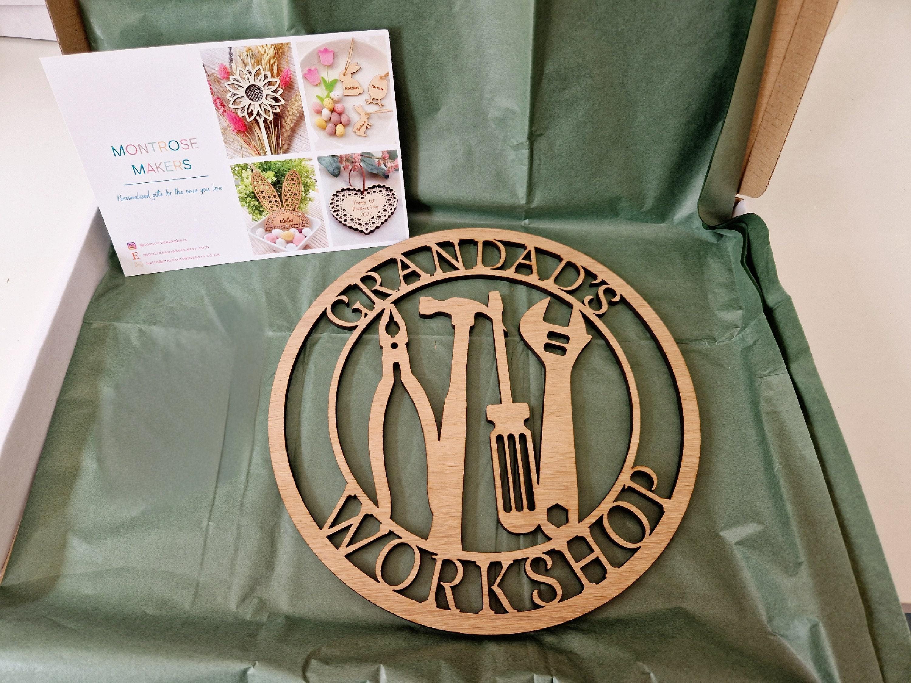 Laser cut from premium 4mm veneered wood, the plaque proudly displays "GRANDAD'S WORKSHOP" in bold capital letters, with integrated nut-shaped hanging holes for easy display. Whether it’s for his shed, garage or hobby nook, this stylish sign adds a personal touch to his space.