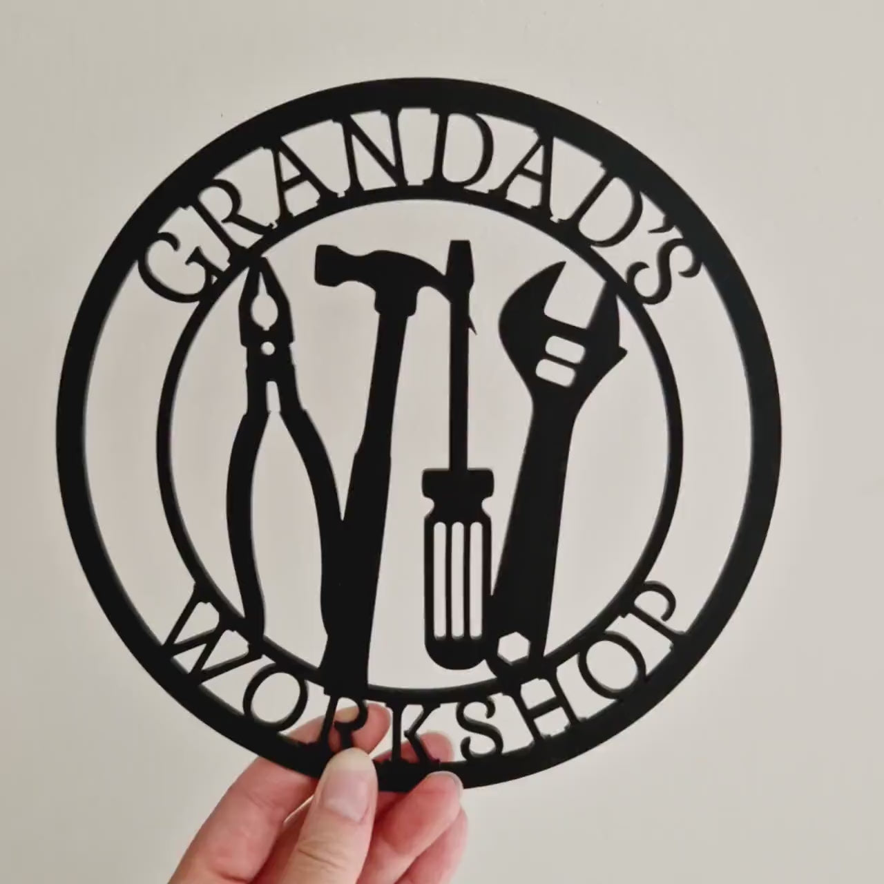 Personalised acrylic workshop plaque – reads “GRANDAD’S WORKSHOP”