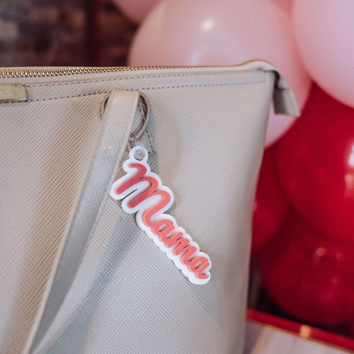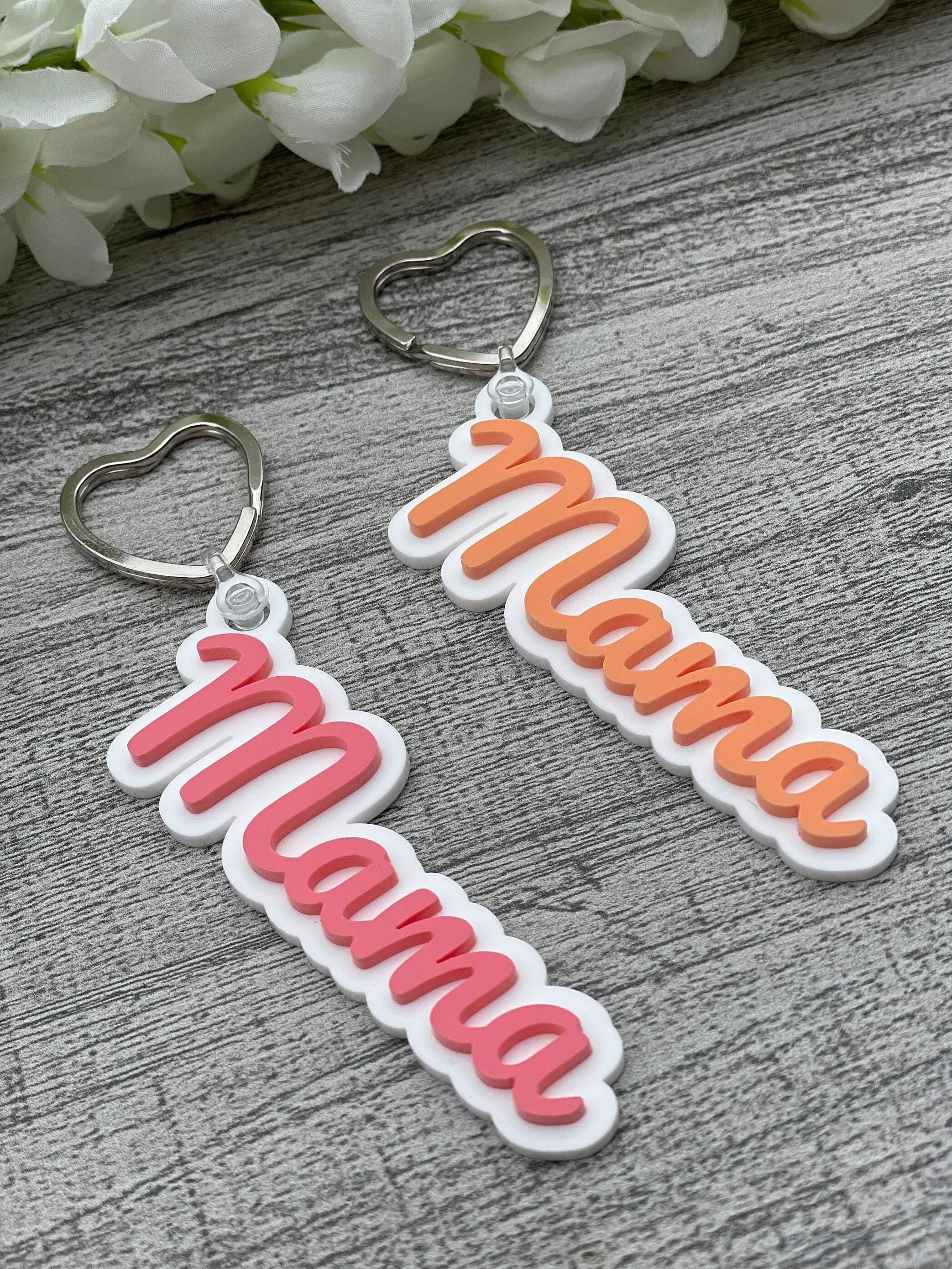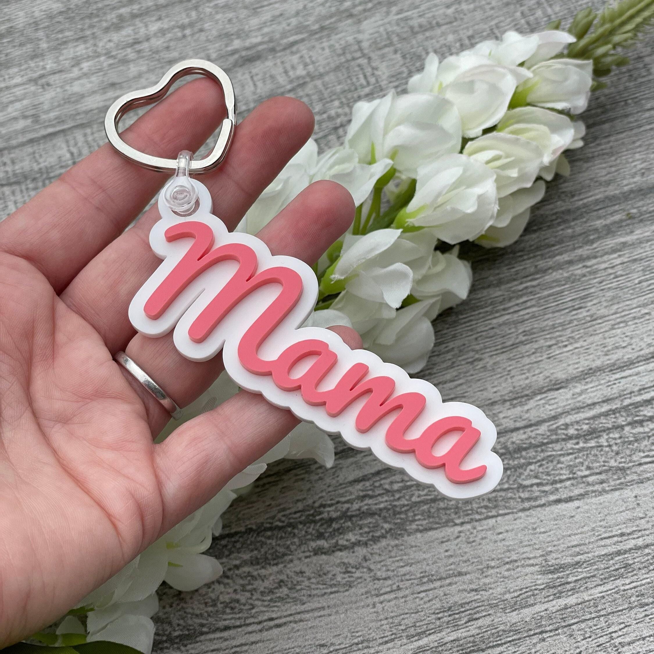 Each keyring features a sleek white acrylic backer with your chosen word—Mama, Mum, Mummy, or another name—cut from high-quality acrylic in a colour of your choice. Finished with a sturdy heart-shaped clasp, it’s designed to add personality and practicality to your everyday essentials.
