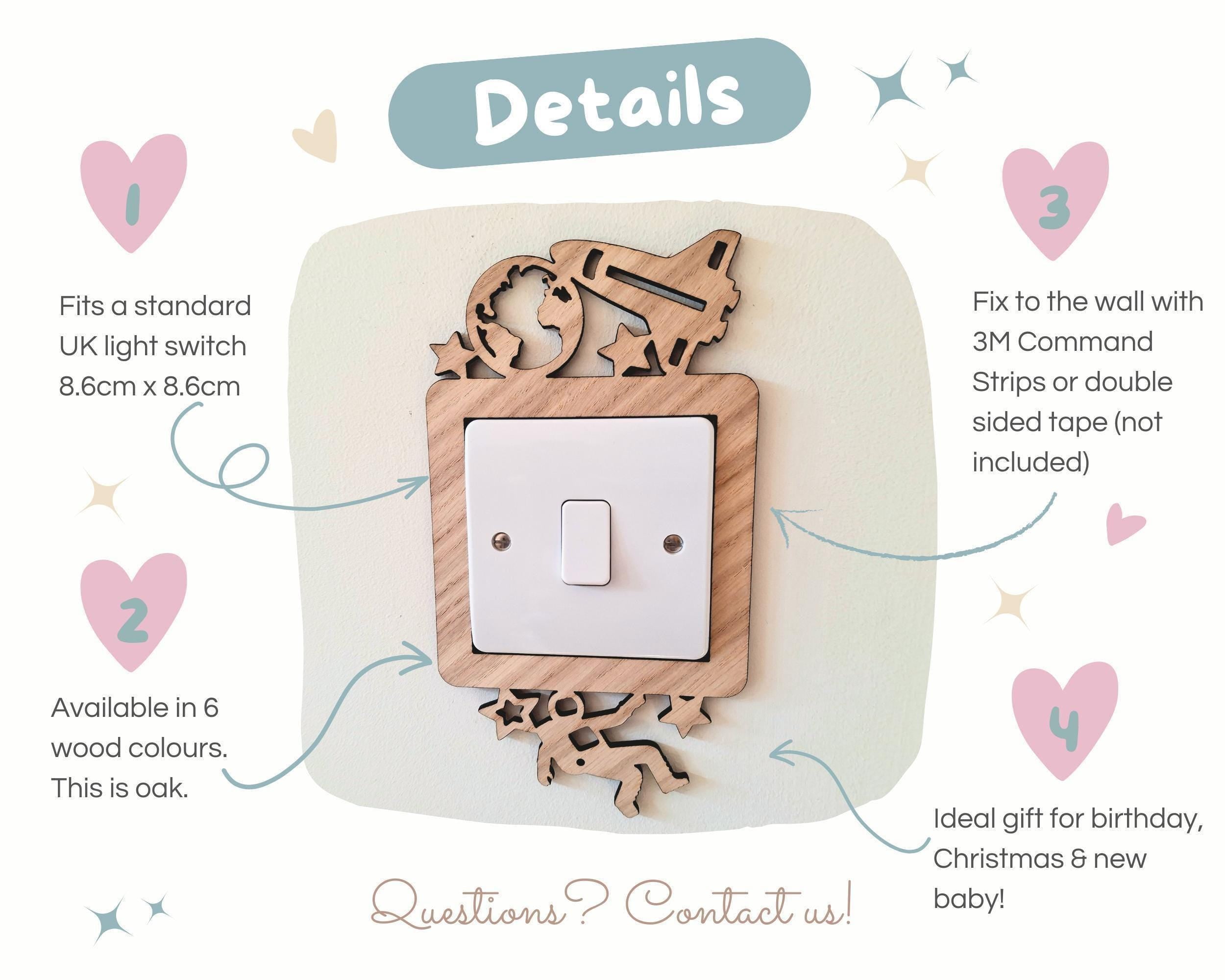Designed to fit a standard UK light switch (8.7cm x 8.7cm), it features planets, stars, rockets and astronauts for that out-of-this-world look. With two design options and six wood finishes to choose from, it’s the perfect finishing touch for your little explorer’s room.