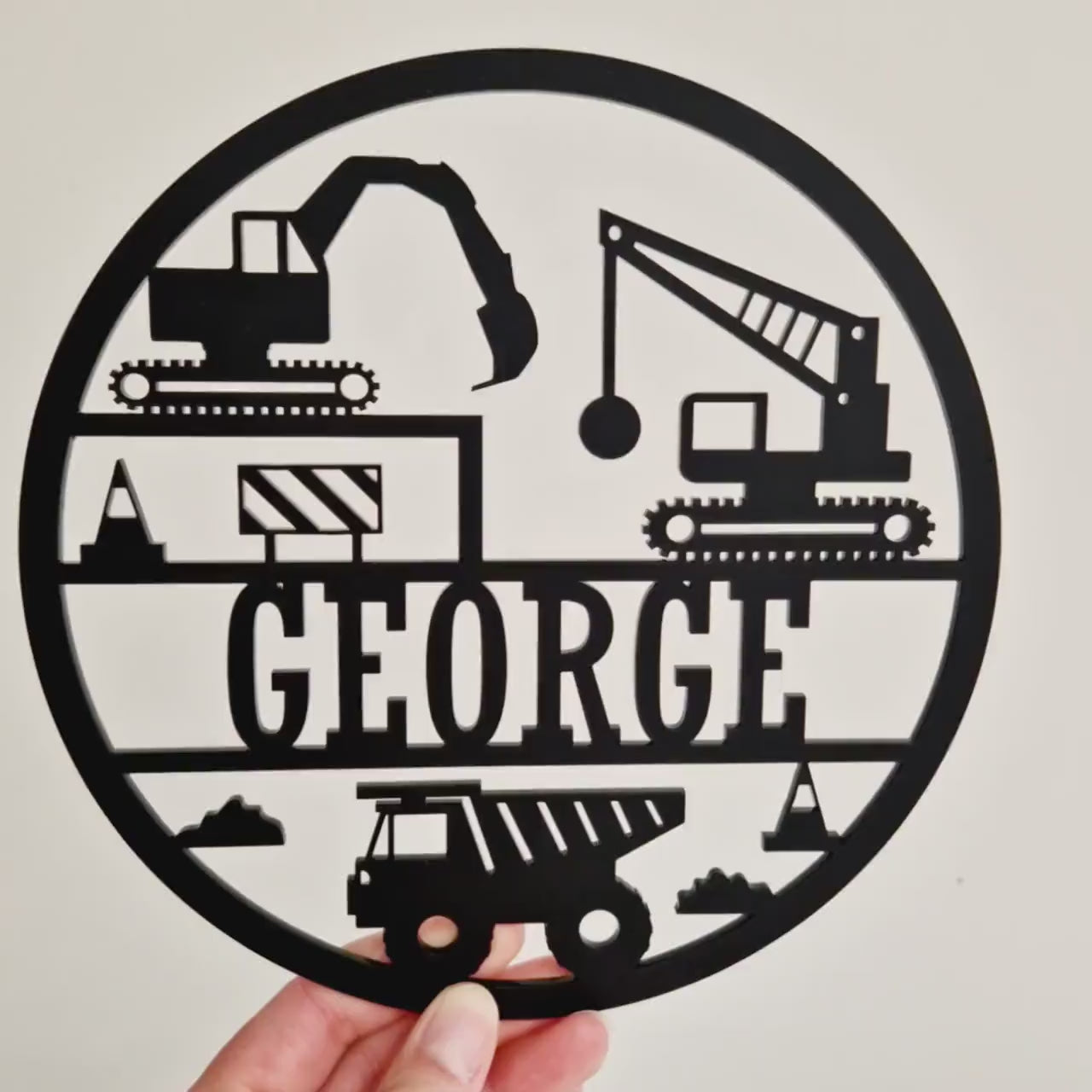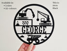 Perfect for mini builders, this personalised round plaque features playful construction site details like a dumper truck, digger and crane – transforming their bedroom, nursery or playroom into a bustling site of creativity and fun.
